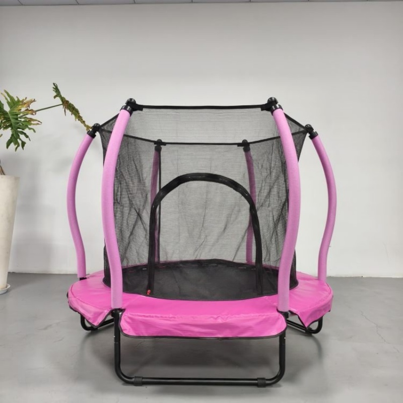 This trampoline establishes a double safety defense, focusing on the U-shaped legs made of reinforced steel pipes and the net pole foam. The foam is tested for elasticity by hand pressing, ensuring it is thick, resistant to deformation, and free from pungent odors. The foam is tightly wrapped without loosening, preventing it from falling off during play, thus ensuring safety through support and protection details.