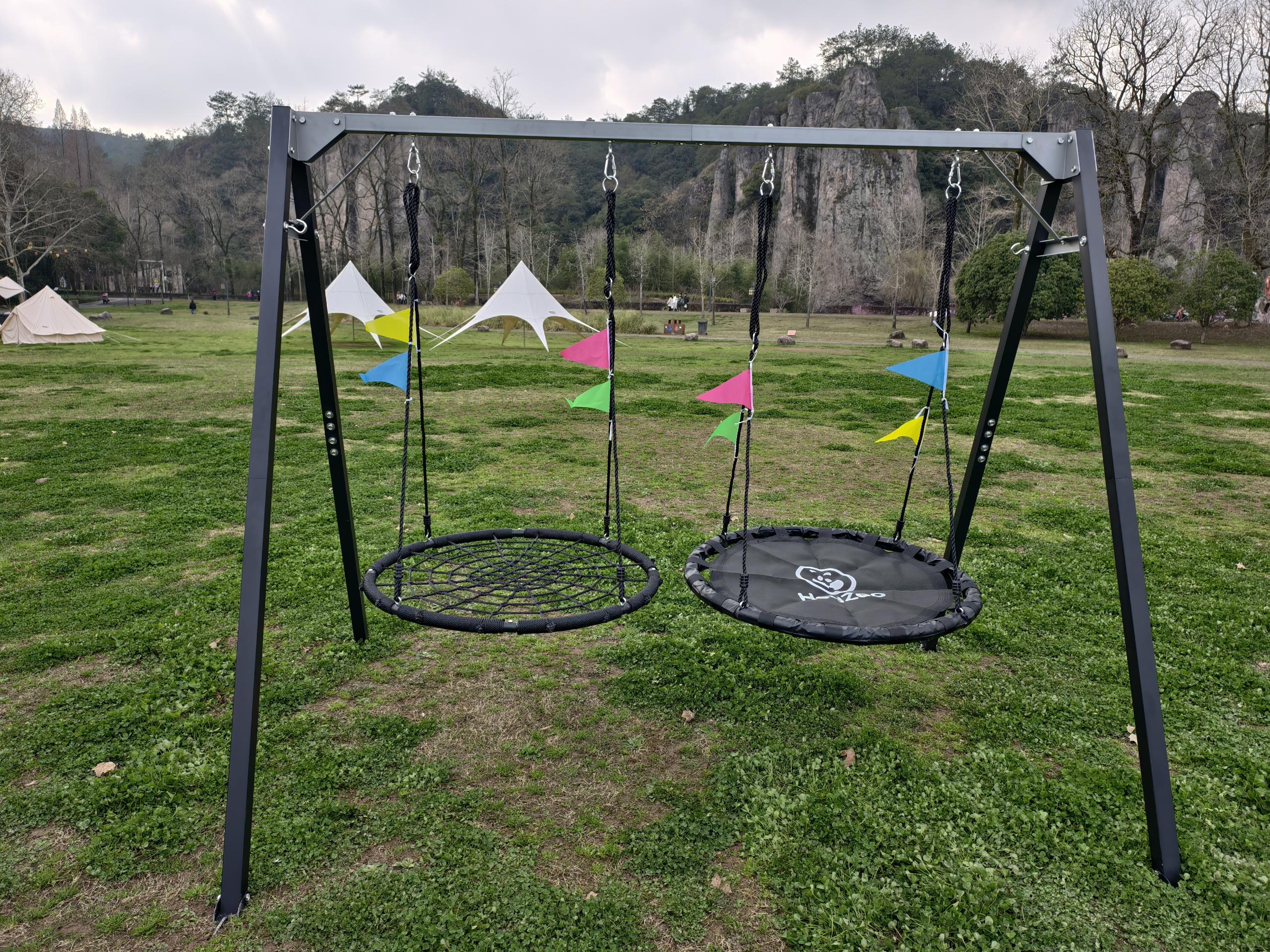 1.Dual-person sharing design, richer interactive experience: The set includes two independent black swings and a compatible swing frame, capable of accommodating two people at the same time, breaking the 'loneliness' of traditional single-person swings. It meets the needs of multiple people sharing, making outdoor leisure time full of companionship and laughter, suitable for family, social, and various other scenarios.