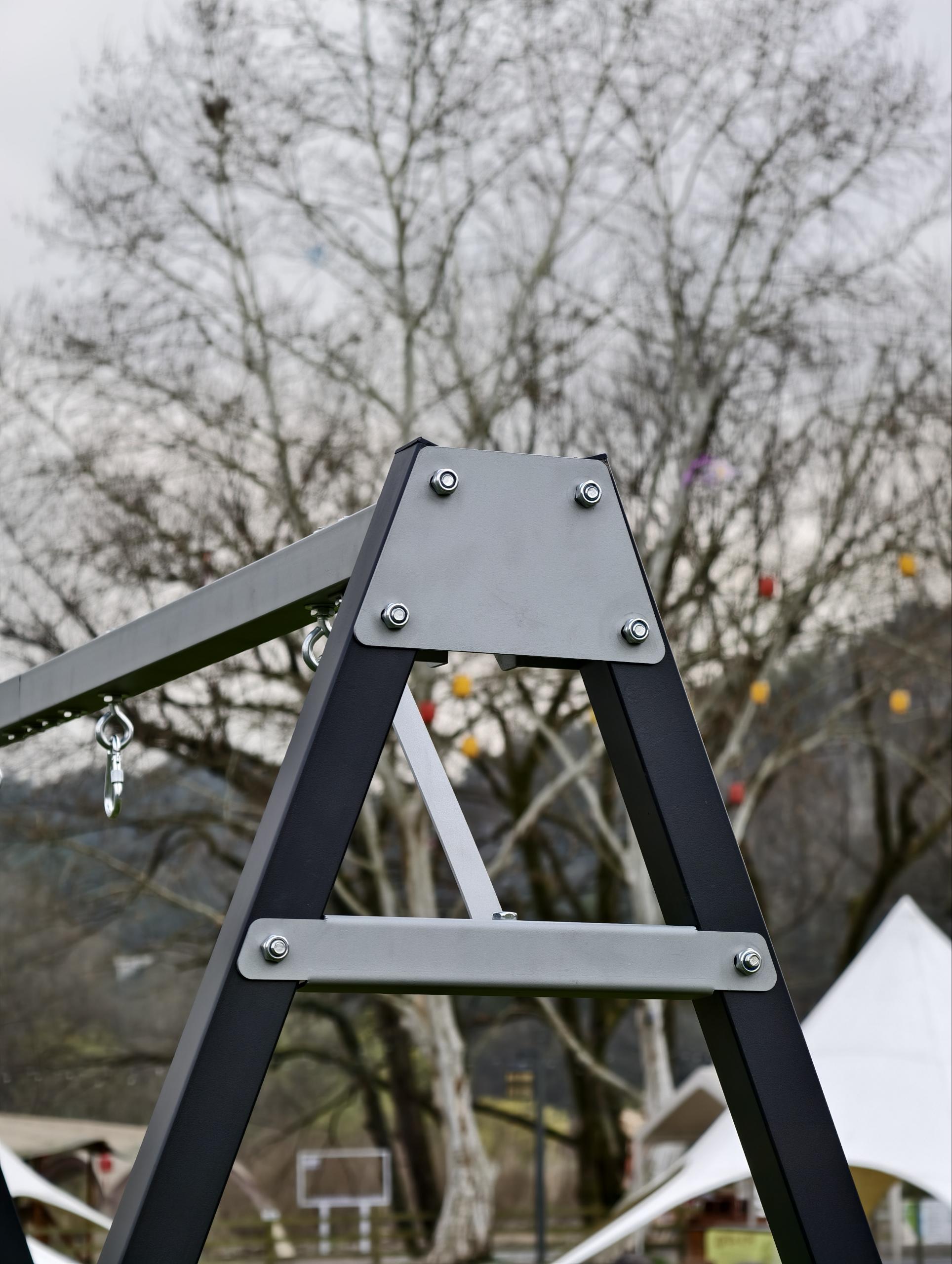 2.High-quality materials + uniform black appearance, high aesthetics and durability: The swing frame uses reinforced and thickened steel, treated for rust and corrosion resistance, paired with a black coating that is wear-resistant and scratch-resistant, able to withstand outdoor sun and rain, remaining stable and colorfast over long-term use; the two swings use high-tensile mesh surfaces made of PE material, soft and comfortable with strong load-bearing capacity, ensuring riding safety. The uniform black tone combines a steady texture with versatile properties, easily integrating into different outdoor spaces such as courtyards and terraces, enhancing the overall scene's aesthetic.