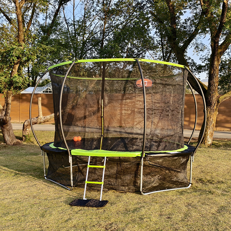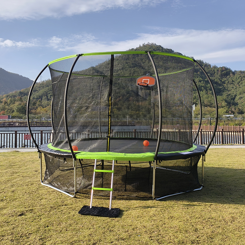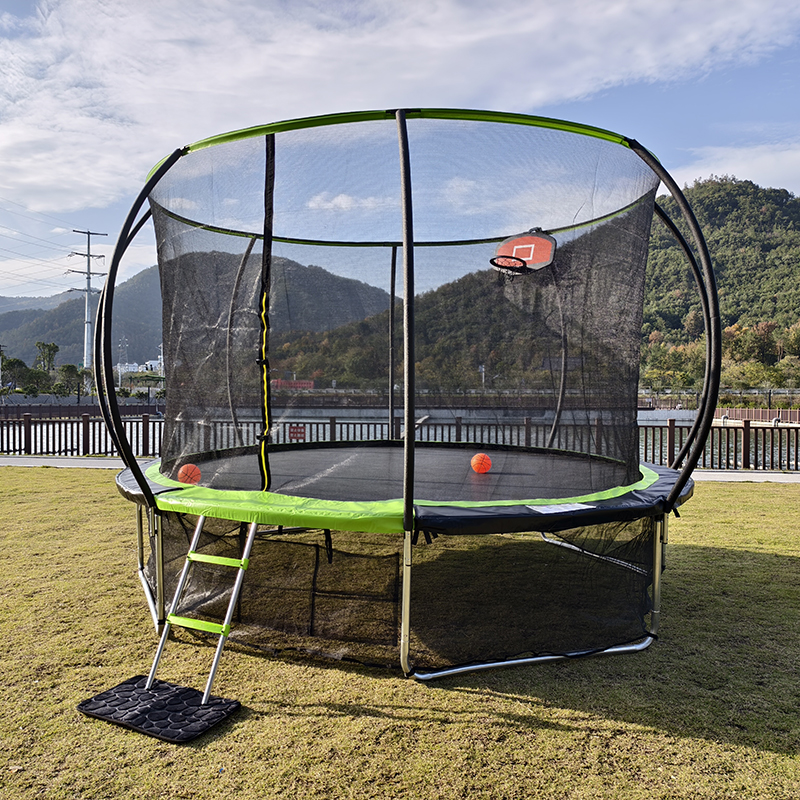 As an outdoor product, the trampoline should be equipped with a rust-resistant galvanized steel frame, a UV-resistant jumping mat, and durable polypropylene safety netting. These features ensure reliable performance across various climates and seasons, extending the product’s lifespan.