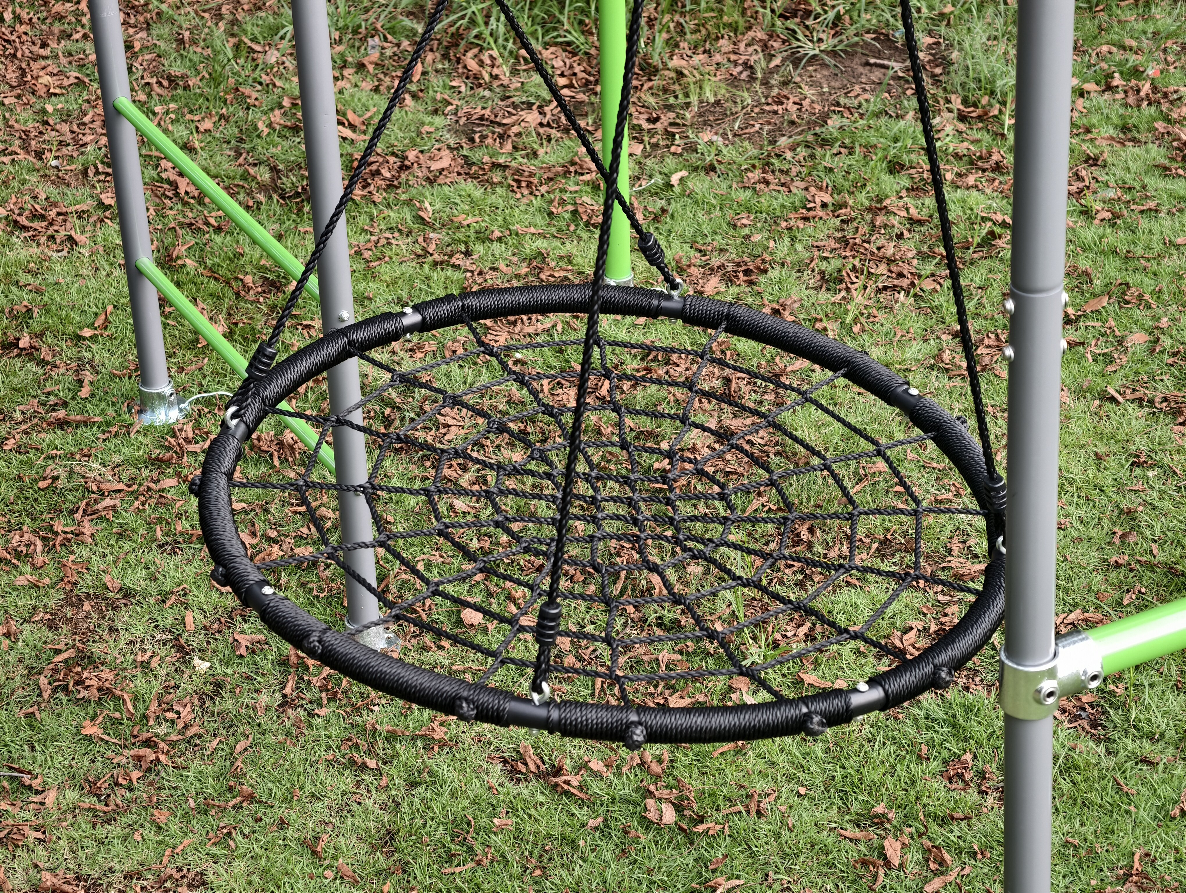 Dual-Function Swing Set: Features a unique black web swing that is both safe and fun, along with an adjustable-length fitness accessory for hanging arm exercises.